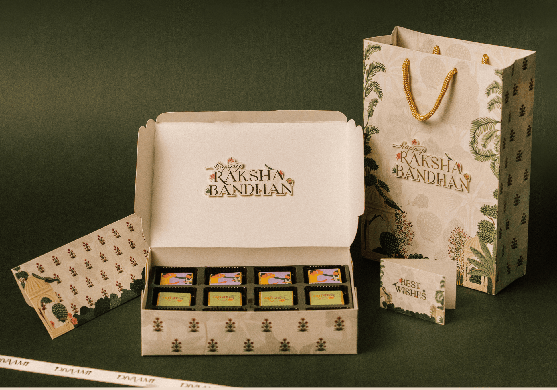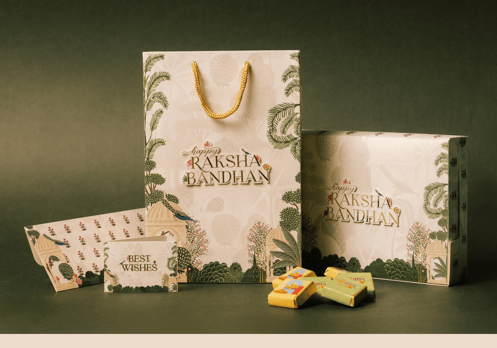 Designed for a complete gifting experience, the hamper also includes a coordinated carry bag, a matching cash envelope, a best wishes card, and a complimentary rakhi β all styled to match the festive peacock print.